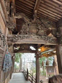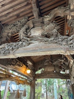 拝殿の彫刻は、立川流・立川和四郎富昌の弟子、池田文四郎(立川文四郎)作で、拝殿正面梁の獅子と龍や、側面の酒呑童子(大江山の鬼頭のことだそうです。)、鶴、亀、千鳥などが見事に彫られています。